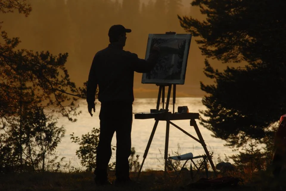 In 2008, I took a trip to Finland with fellow painter Paul Reuther for about a month. The photo below ( taken by a Dutch tourist) is of me painting on the Kemijoki River, about 50 miles north of the Arctic Circle, in southern Lapland. We were there in June, and it stayed light until roughly 11 p.m.! So it was possible to start a painting at 9 o'clock at night and get a good session in! Available paintings are priced, click on image to enlarge and put cursor over bottom of the image to view specifications.